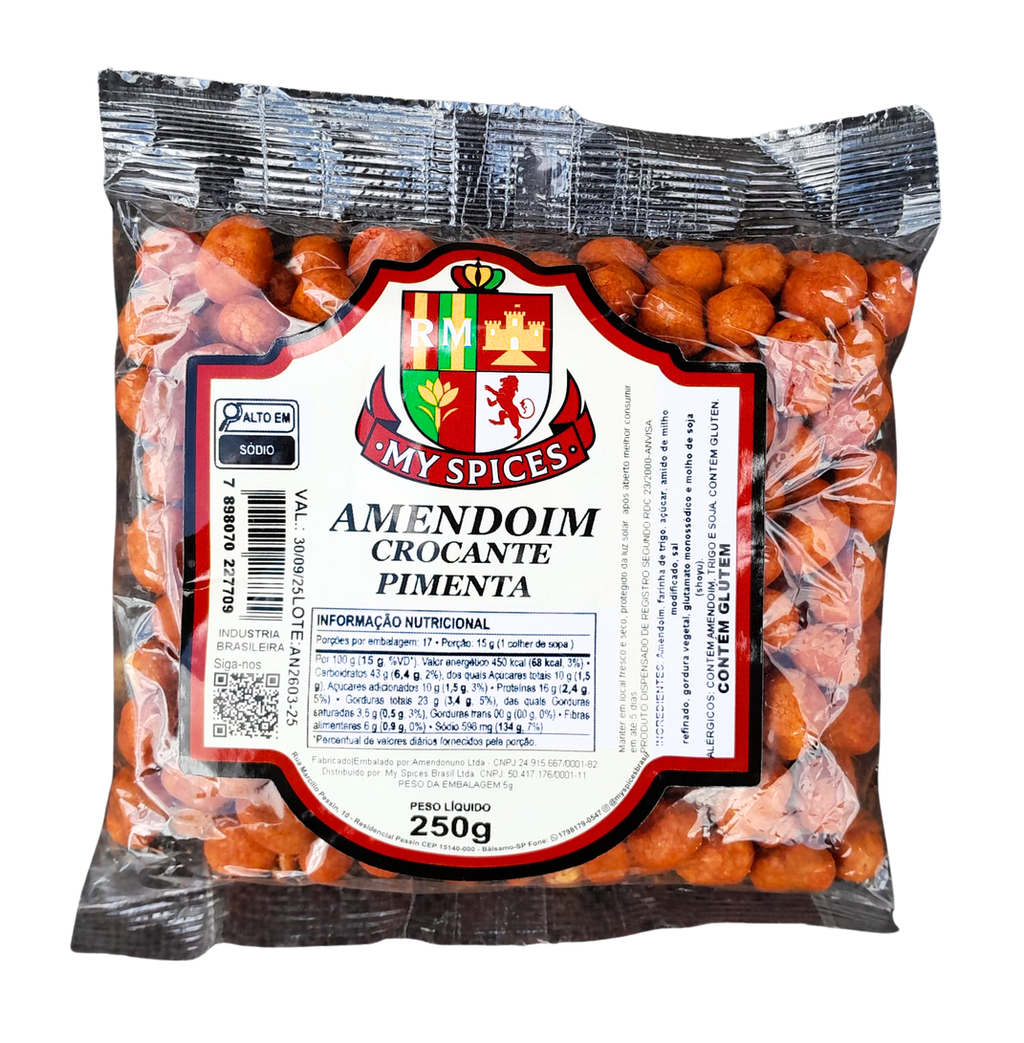 Adicione um toque de ousadia aos seus petiscos com o Amendoim Crocante Premium sabor Pimenta da My Spices! Embalagem de 250g com a crocância que você adora e um sabor picante que conquista. Perfeito para acompanhar sua bebida preferida.
